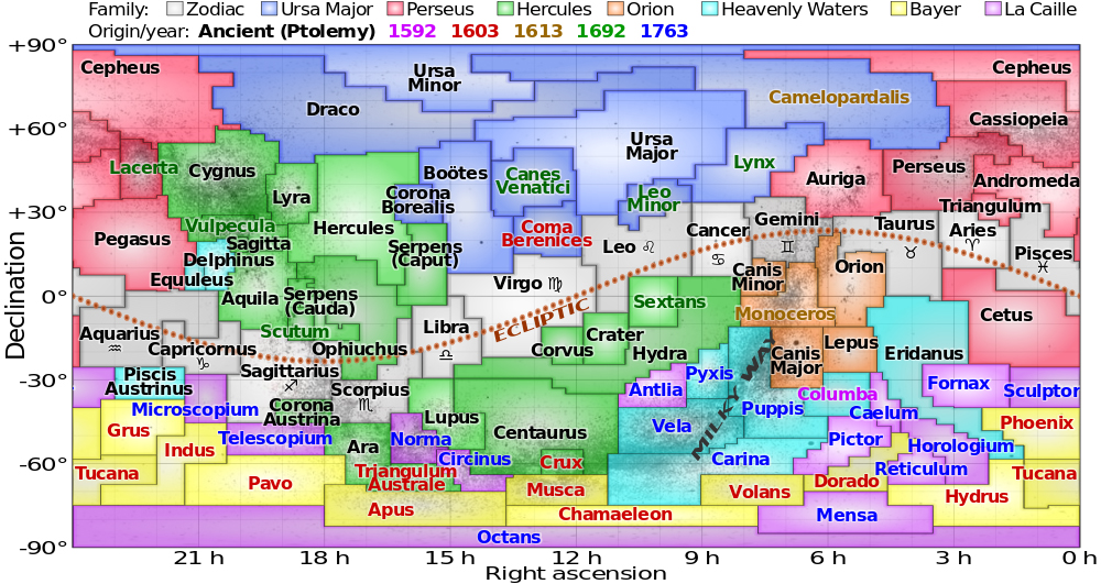 Here is the monthly list of constellations to study. The charts are reproduced from the International Astronomical Union listing. We suggest you follow the Constellation Hunter Observing Program rules for observing, sketching, and recording your observations for achieving the award. The individual monthly charts for all the constellations are available here.