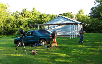 There are two permanent telescopes kept at the observatory. One is a 12 1/2" Newtonian reflector with an equatorial mount. (Kingsburry Corporation in Keene donated the mirror for the 12 1/2" and club members constructed the body on the equatorial mount.) The other is a 15" f/4.5 Obsession reflector which has a Dobsonian mount and is portable for off-site events.